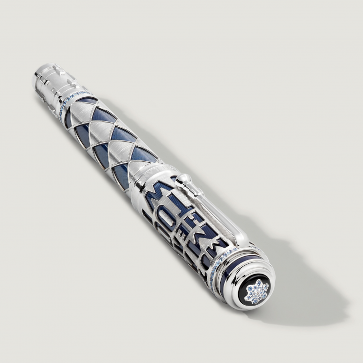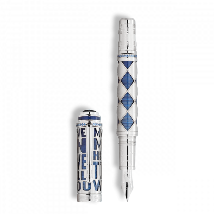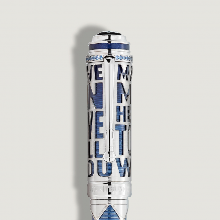 Dans l'histoire passionnante de la musique rock, peu de noms ont brillé avec autant de constance que celui de Queen. Fort d'une carrière de plus de cinq décennies, le groupe est l'un des plus grands succès de tous les temps. Au cours de cette période, Queen a incarné le pouvoir de la créativité musicale et la plupart de leurs chansons sont restées en tête des hit-parades pendant des semaines. Ils ont créé une sorte d'univers musical qui leur est propre, composé d'une combinaison de hard rock, de glam rock, de pop, de funk et d'opéra, faisant voler en éclats les frontières entre les genres. En hommage au tout dernier album de Queen, les titres de trois de ses chansons ornent l’ouvrage squeletté en or blanc massif Au 750/1000 sur le capuchon  : Mother Love, Made In Heaven et Too Much Love Will Kill You. Les rainures sur la laque bleue contrastante en dessous reflètent exactement les mêmes rainures que celles de l'album Made in Heaven. La progression de couleur du bleu foncé au bleu pâle, puis de nouveau au bleu foncé, rappelle la palette de couleurs de la pochette de l'album. En réalisant leurs albums, les quatre membres du groupe ont repoussé les limites artistiques et techniques du studio d'enregistrement. Mais voir le groupe en concert était tout autre chose. Leurs concerts sensationnels – ils ont donné plus de 700 concerts entre 1970 et 1986 – étaient un spectacle à part entière qui a atteint le statut de légende. Freddie Mercury lui-même, connu pour ses costumes de scène flamboyants, se glissait souvent dans la peau d'un personnage de la Commedia dell'Arte, Arlequin. Sa célèbre combinaison moulante à motifs losanges noirs et blancs soulignait son personnage de scène non conventionnel. Le Great Characters Hommage à Queen Limited Edition 30 reprend ce motif rhombique pour le corps du stylo, habilement interprété sous la forme de losanges en or blanc massif Au 750/1000 sur fond laqué bleu. Une bande de saphirs bleus marque la transition entre le corps et le cône doré à l’or blanc, dont la forme rappelle les boutons de réglage du volume et de la tonalité d'une guitare électrique, instrument qui a joué un rôle essentiel dans le son unique de Queen. La pointe du cône est incrustée d'un insert unique, réalisé à partir du bois des baguettes originales de Roger Taylor, finement entrelacé avec des cordes de guitare que Brian May a lui-même utilisées. En hommage à l'album Made In Heaven et pour marquer le 30e anniversaire de sa sortie, cette édition est limitée à seulement 30 exemplaires. Inspirée de la pochette de l'album, la plume en or massif Au 750/1000 rhodiée, fabriquée à la main, représente la silhouette de Freddie Mercury dans l'une de ses poses scéniques les plus emblématiques et triomphantes. En reconnaissance du rôle important joué par chaque membre du groupe, leurs signatures ornent la partie avant du bijou d'écriture. Un anneau composé de précieux saphirs bleus entoure le capuchon en or blanc massif Au 750/1000, au-dessus duquel le dôme arbore l'emblème Montblanc composé de saphirs bleus sertis pavé. En souvenir de la présence scénique électrisante du groupe, l'agrafe est conçue pour ressembler à un pied de micro, un accessoire simple utilisé à des effets spectaculaires lors des concerts.