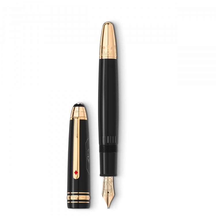 La collection Meisterstück Around the World in 80 Days est inspirée du fameux roman d’aventures de Jules Verne. Le stylo plume LeGrand en résine précieuse anthracite renvoie à la deuxième partie du voyage, de Bombay à Yokohama. Dans cette partie de l’aventure, les personnages principaux se déplacent à dos d’un éléphant majestueux, qui apparaît dans une cartouche sur le capuchon. L’agrafe est ornée de cartes de carreau laquées rouges, symbole des jeux d’argent et de cartes, tandis que le cône est gravé d’un motif inspiré des bijoux de la princesse Aouda et des cartes. Sur le sommet du capuchon figure la durée du voyage embossée, soit 80 jours dont 25 de Bombay à Yokohama. L’instrument d'écriture est doté d’une plume en or 18 K fabriquée à la main, ornée d’une montgolfière et des dates « 20/10 » et « 14/11 » : Mr Fogg quitte Bombay à 20 h 00 le 20 octobre, puis part de Yokohama à 18 h 00 le 14 novembre.