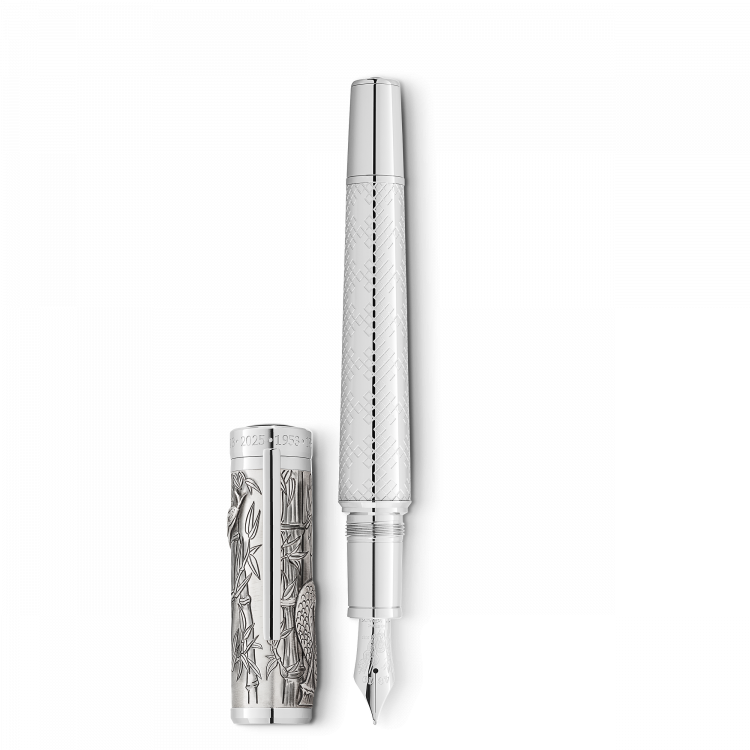 Le Montblanc The Legend of Zodiacs The Snake Limited Edition 512 (8 x 8 x 8) est consacré au sixième signe du zodiaque ainsi qu’au chiffre 8, porte-bonheur dans les cultures asiatiques. Le capuchon en argent massif 925 est orné d’un serpent au milieu d'une forêt de bambous, gravé à la main. Son corps long et souple, synonyme de longue vie et de bonheur, s’enroule autour d’une tige de bambou solide avec sa tête relevée. Du fait de sa capacité à redevenir droit après chaque tempête, le bambou est un symbole de vitalité, de succès et de flexibilité. Il pousse en avril, qui est également le mois associé au serpent. Le corps platiné est décoré d’une fine gravure ornementale inspirée du nœud chinois porte-bonheur « Zhongguó jié ». Le cône est serti de trois opales en référence à la pierre de naissance du signe du serpent. L’actuelle année du serpent, 2025, est gravée sur l’anneau du capuchon avec les six années du serpent précédentes. Le capuchon est couronné de l’emblème Montblanc en nacre. Une fine gravure du serpent enroulé autour d’une tige de bambou orne la plume façonnée à la main en or au 750/1000 rhodié.