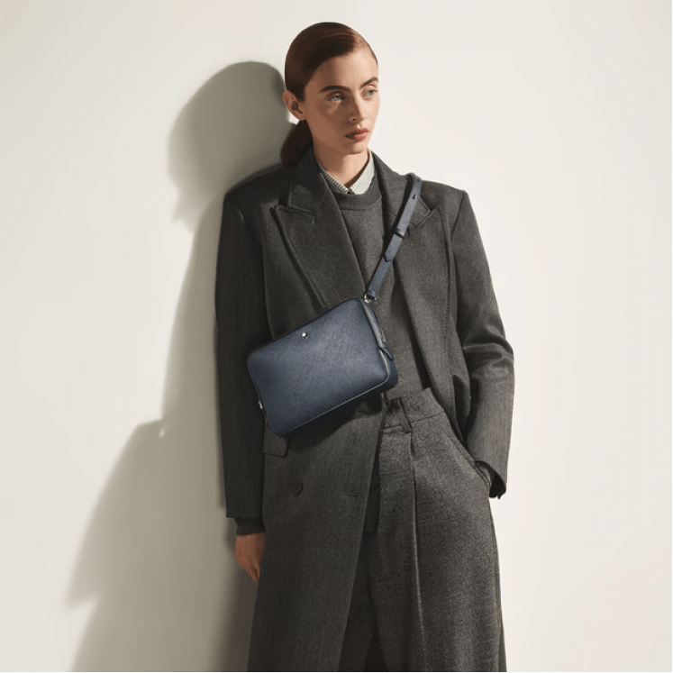 Inspiré par le monde de l'écriture, ce mini sac à bandoulière est fabriqué en cuir embossé Sartorial dans une combinaison bicolore raffinée de bleu et de noir. Conçu pour être polyvalent, il peut être porté à la main ou à l'épaule grâce à sa bandoulière réglable et amovible. Pour plus de fonctionnalité, il est muni d'une bande en cuir à l'arrière, ce qui permet de l'attacher à des sacs plus grands.