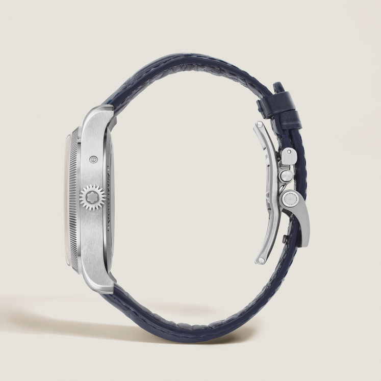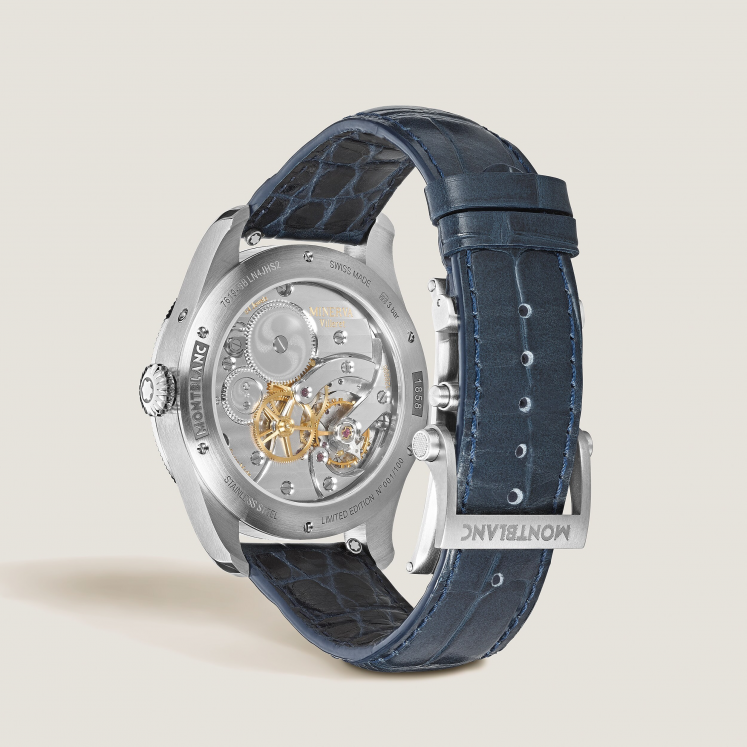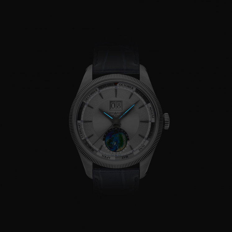 La Montblanc 1858 Annual Calendar Geosphere Limited Edition s'inspire des codes esthétiques de l'héritage de Minerva dans les années 1950 avec son cadran soleillé et grainé de couleur blanc argenté avec des aiguilles et des index revêtus de bleu. Le boîtier en acier inoxydable de 42 mm est équipé d'une lunette cannelée fixe en or blanc 750/1000 (18 carats) inspirée des garde-temps historiques de Minerva. Le garde-temps est animé par un calibre de manufacture à remontage manuel MB M14.58, doté d'un calendrier annuel, d'une grande date et d'une fonction heures universelles. Pour les fonctions de calendrier annuel, la grande date est positionnée à 12 heures et comporte deux grandes ouvertures placées côte à côte, tandis que les mois sont affichés sur le pourtour du cadran. Le principal élément visuel de ce garde-temps est sans aucun doute son globe rotatif tridimensionnel peint à la main, représentant l'hémisphère nord avec l'indication jour et nuit et une échelle de 24 heures. Le garde-temps est complété par un bracelet interchangeable en cuir de veau bleu avec impression alligator et une boucle déployante triple en acier inoxydable avec système de réglage fin.