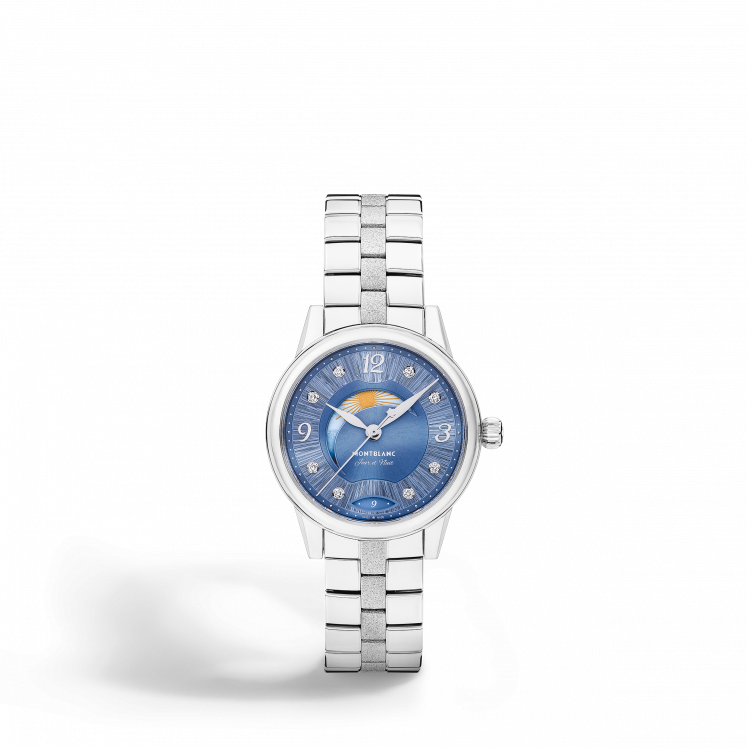 Livrant une interprétation élégante et féminine des codes de la Haute Horlogerie, la Montblanc Bohème Day & Night, inspirée de l'univers de l’écriture et de l’aquarelle, est présentée dans un boîtier de 30 mm en acier inoxydable. Elle est dotée d'un élégant cadran brossé bleu orné d’index en diamant et de chiffres arabes floraux et d’aiguilles rhodiées. Parmi les autres détails raffinés, on compte un motif filet sauté et une technique d’estampage baptisée « filé d’étoiles ». Animé par le calibre automatique MB 24.20, ce modèle indique les heures, les minutes et les secondes, ainsi que la date, affichée dans une ouverture en forme d’amande dotée de chiffres manuscrits. La police de caractères romantique a également été utilisée sur le cadran, pour la mention « Jour et Nuit ». La complication céleste jour & nuit montre le changement de couleur du ciel au cours d'une période de 24 heures et apporte une touche romantique et artistique à la montre, étant donné qu’elle est créée en aquarelle. Cette montre est équipée d'un bracelet en acier inoxydable interchangeable à maillons centraux texturés et d'un système de réglage fin.
