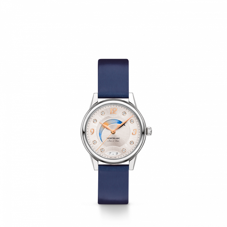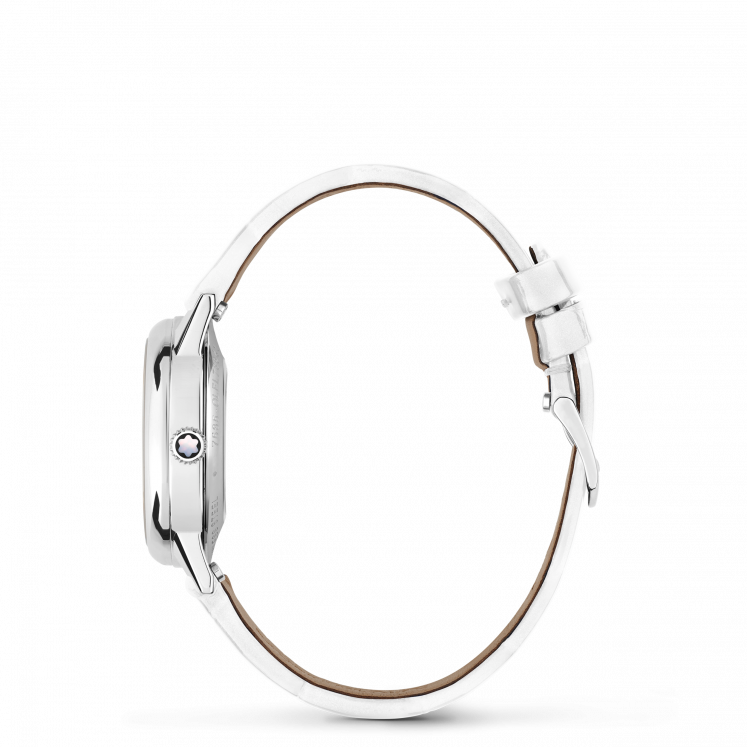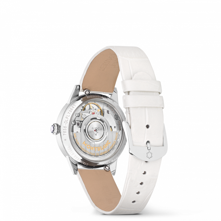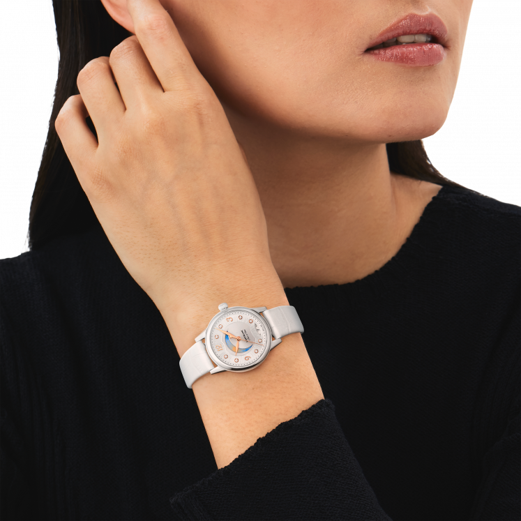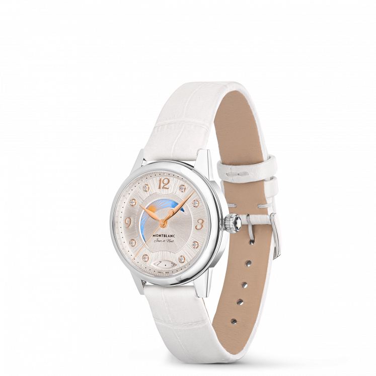 Livrant une interprétation élégante et féminine des codes de la Haute Horlogerie, la Montblanc Bohème Day & Night, inspirée de l'univers de l’écriture et de l’aquarelle, est présentée dans un boîtier de 30 mm en acier inoxydable. Elle est dotée d'un élégant cadran brossé couleur blanc argenté orné d’index en diamant et de chiffres arabes floraux et d’aiguilles dorés à l’or rose. Parmi les autres détails raffinés, on compte un motif filet sauté et une technique d’estampage baptisée « filé d’étoiles ». Animé par le calibre automatique MB 24.20, ce modèle indique les heures, les minutes et les secondes, ainsi que la date, affichée dans une ouverture en forme d’amande dotée de chiffres manuscrits. La police de caractères romantique a également été utilisée sur le cadran, pour la mention « Jour et Nuit ». La complication céleste jour & nuit montre le changement de couleur du ciel au cours d'une période de 24 heures et apporte une touche romantique et artistique à la montre, étant donné qu’elle est créée en aquarelle. Ce garde-temps est équipé d’un bracelet interchangeable en cuir de veau blanc à imprimé alligator, et d'un bracelet supplémentaire.