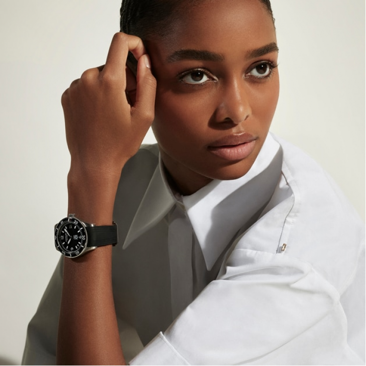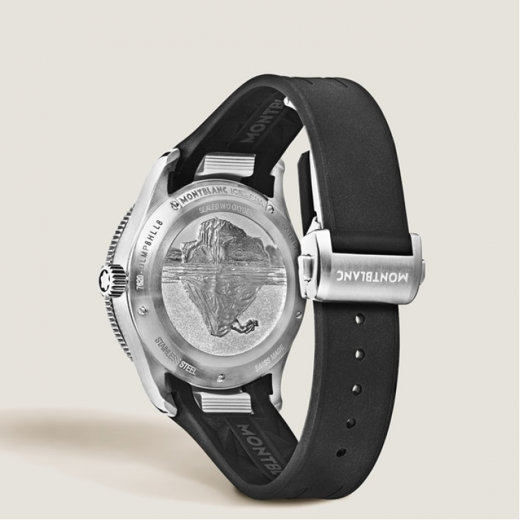 La Montblanc Iced Sea Automatic Date 0 Oxygen, avec son cadran noir à motif glaciaire, donne l'impression de regarder dans les profondeurs d'un glacier. Inspirée de la Mer de Glace, cette texture glaciale a été réalisée à l'aide d'une technique ancestrale presque oubliée appelée gratté-boisé. La montre est logée dans un boîtier de 38 mm en acier inoxydable totalement dépourvu d'oxygène et s'accompagne d'une lunette tournante unidirectionnelle avec insert en céramique noir, d'un fond de boîtier embossé et d'un bracelet interchangeable en caoutchouc noir avec système d'ajustement fin. Cette montre est conforme à la norme ISO 6425 pour la plongée sous-marine, et se caractérise par une étanchéité à 300 m.