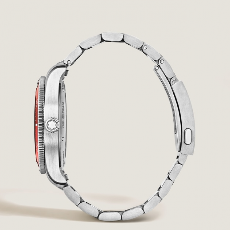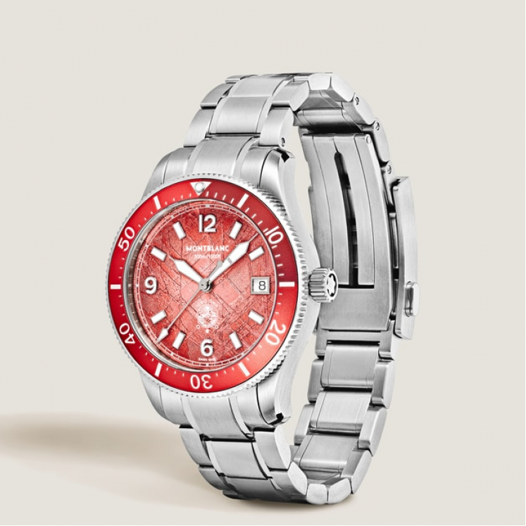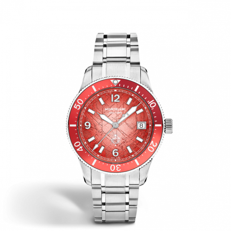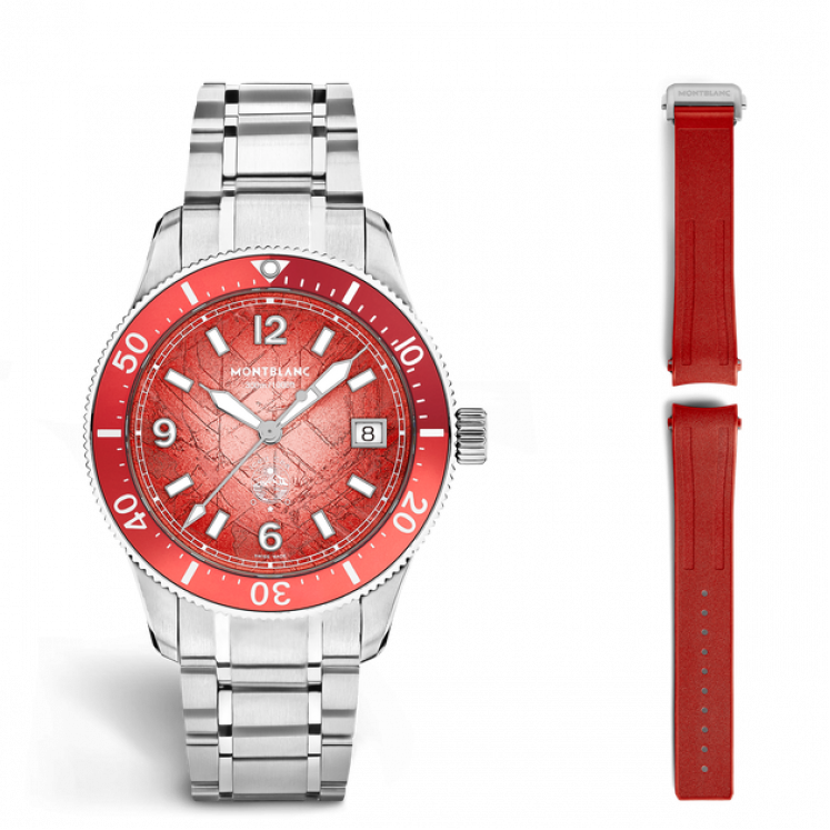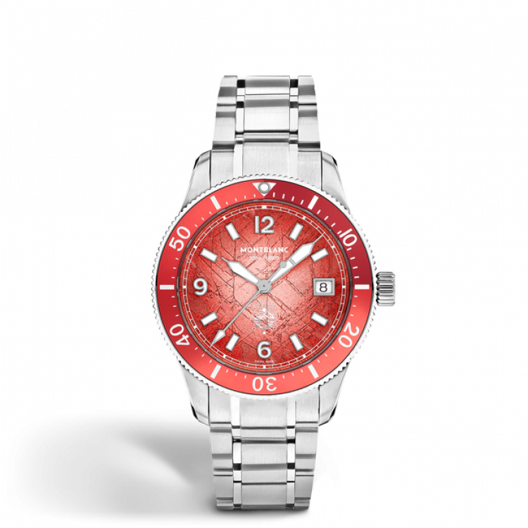 La Montblanc Iced Sea Automatic Date 0 Oxygen Limited Edition, avec son cadran couleur corail Sfumato à motif glaciaire, donne l'impression de regarder dans les profondeurs d'un glacier. Inspirée de la Mer de Glace, cette texture glaciale a été réalisée à l'aide d'une technique ancestrale presque oubliée appelée gratté-boisé. La montre est logée dans un boîtier de 38 mm en acier inoxydable totalement dépourvu d'oxygène et s'accompagne d'une lunette tournante unidirectionnelle avec insert en aluminium anodisé corail bicolore, et d'une gravure en 3D sur le fond du boîtier. Cette édition limitée à 300 pièces est livrée avec un bracelet interchangeable et réglable en acier inoxydable et un bracelet en caoutchouc de couleur corail, qui peuvent être rapidement et facilement remplacés sans avoir besoin de retourner en boutique ou d'utiliser quelconque outil. Cette montre est conforme à la norme ISO 6425 pour la plongée sous-marine, et se caractérise par une étanchéité à 300 m.