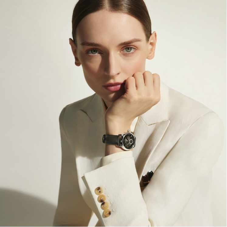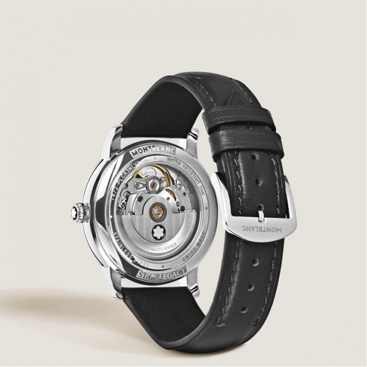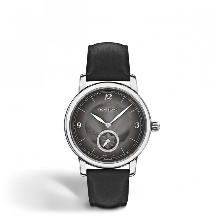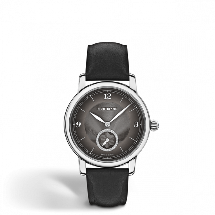 La Montblanc Star Legacy Automatic Small Second porte les codes de design les plus raffinés de la Maison à un nouveau niveau d'élégance. La montre présente un cadran anthracite Sfumato orné d'un motif en forme d'étoile guilloché, un filet sauté, des chiffres arabes rhodiés, des aiguilles en forme de feuille et indique les heures, les minutes ainsi que les secondes mises en valeur par un compteur serti de 30 diamants taille brillant (env. 0,06 carat) d'une manière simple et élégante. Ce modèle est doté d'un mouvement automatique MB 24.16 et est logé dans un boîtier en acier inoxydable de 36 mm de forme galet, avec un fond de boîtier ajouré offrant une vue sur la masse oscillante ornée de l'emblème Montblanc. Le bracelet en cuir de veau noir a été conçu spécialement par Marco Tomasetta, directeur artistique de Montblanc, qui s'est inspiré des plumes d'instrument d'écriture de la Maison pour sa forme pointue.
